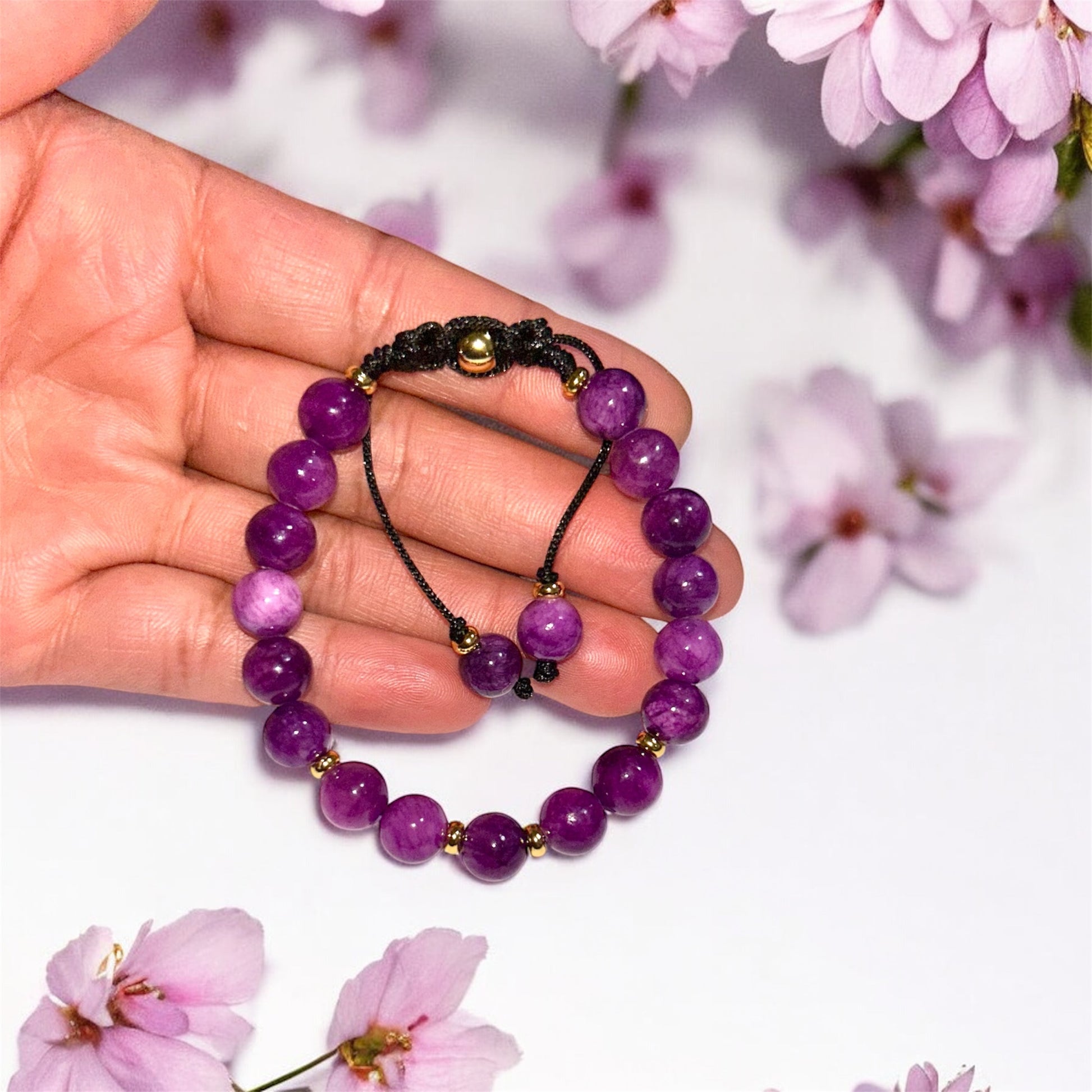 This adjustable Amethyst Quartz bracelet features polished violet stones accented with delicate gold-tone spacers. Known for its calming and protective energy, amethyst is believed to promote balance, clarity, and inner peace. Finished with a durable adjustable cord for a comfortable, custom fit—perfect for everyday wear or mindful moments.