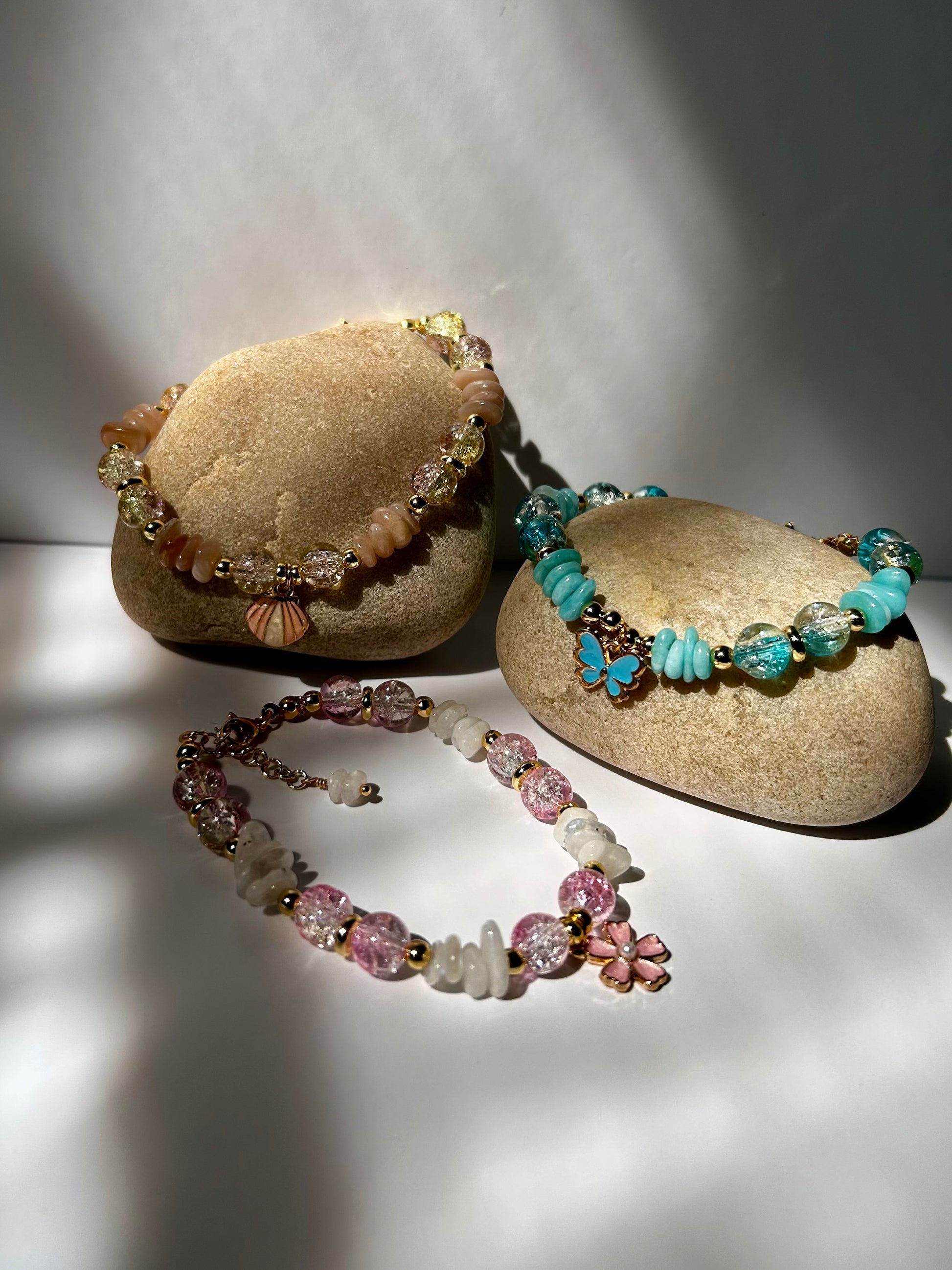 Introducing our stunning Charm Moonstones Bracelet and Earrings set! Crafted Moin gemstone and Crackle glass beads, this set exudes sophistication. The 14K gold plated metal adds a touch of elegance, while the beautiful butterfly charm embodies the perfect blend of nature and beauty. Elevate your style with this exquisite handcrafted set.
