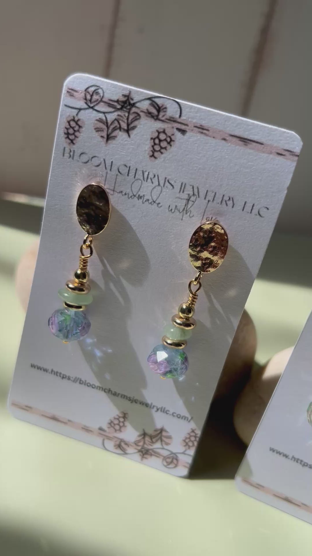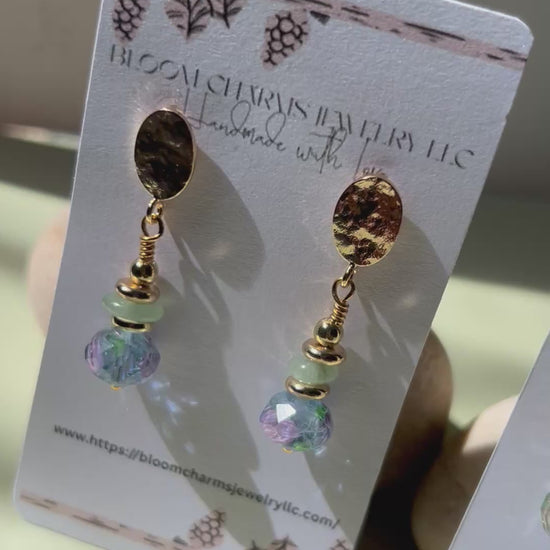 Garden Drop Earrings with Green Moonstone & Colorful 8mm Beads Gold-Tone Hooks Unique Jewelry Design