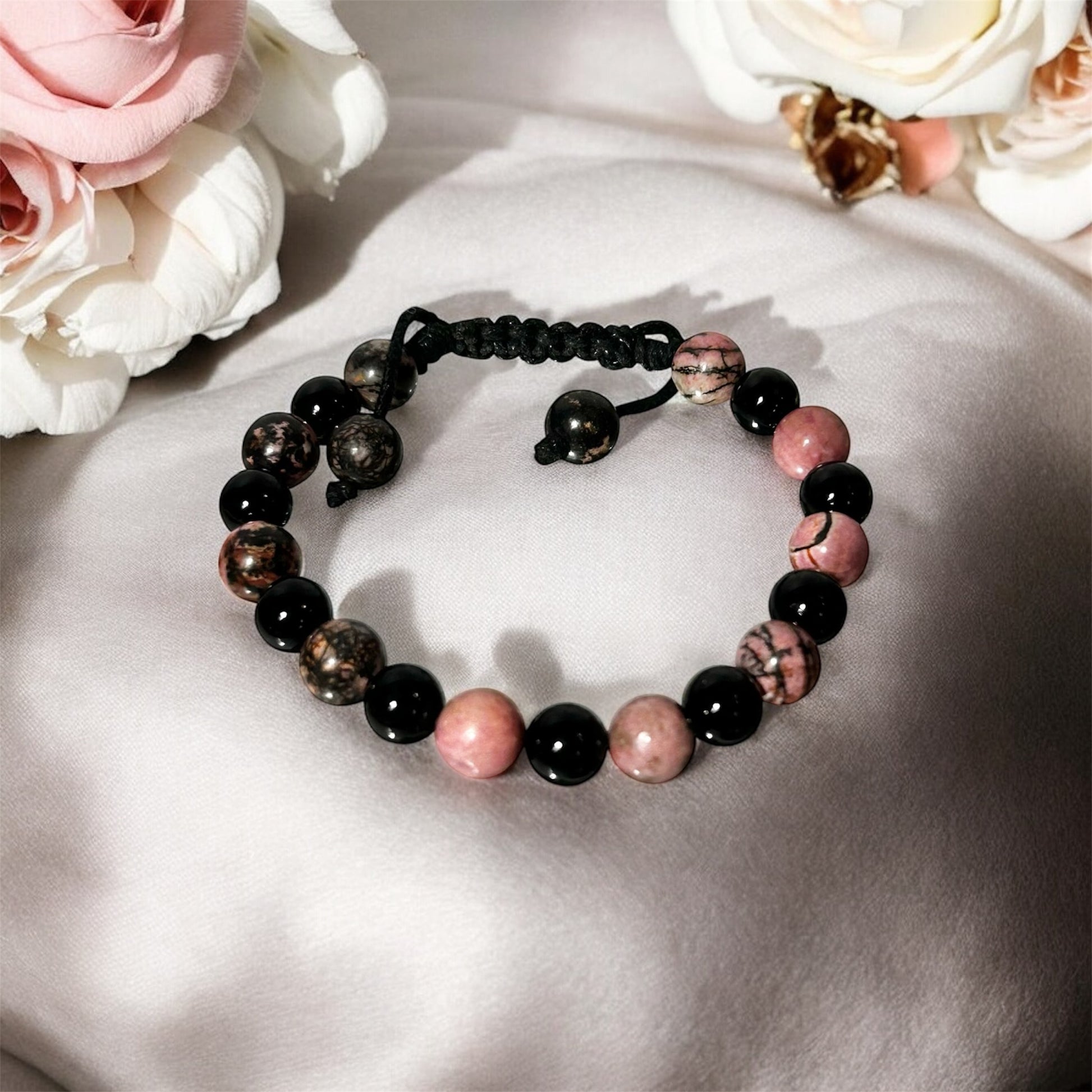 ✨ Discover the Natural Gemstone Bracelet featuring Rhodonite and Black Onyx stones. This adjustable bracelet offers self-love and protection properties.