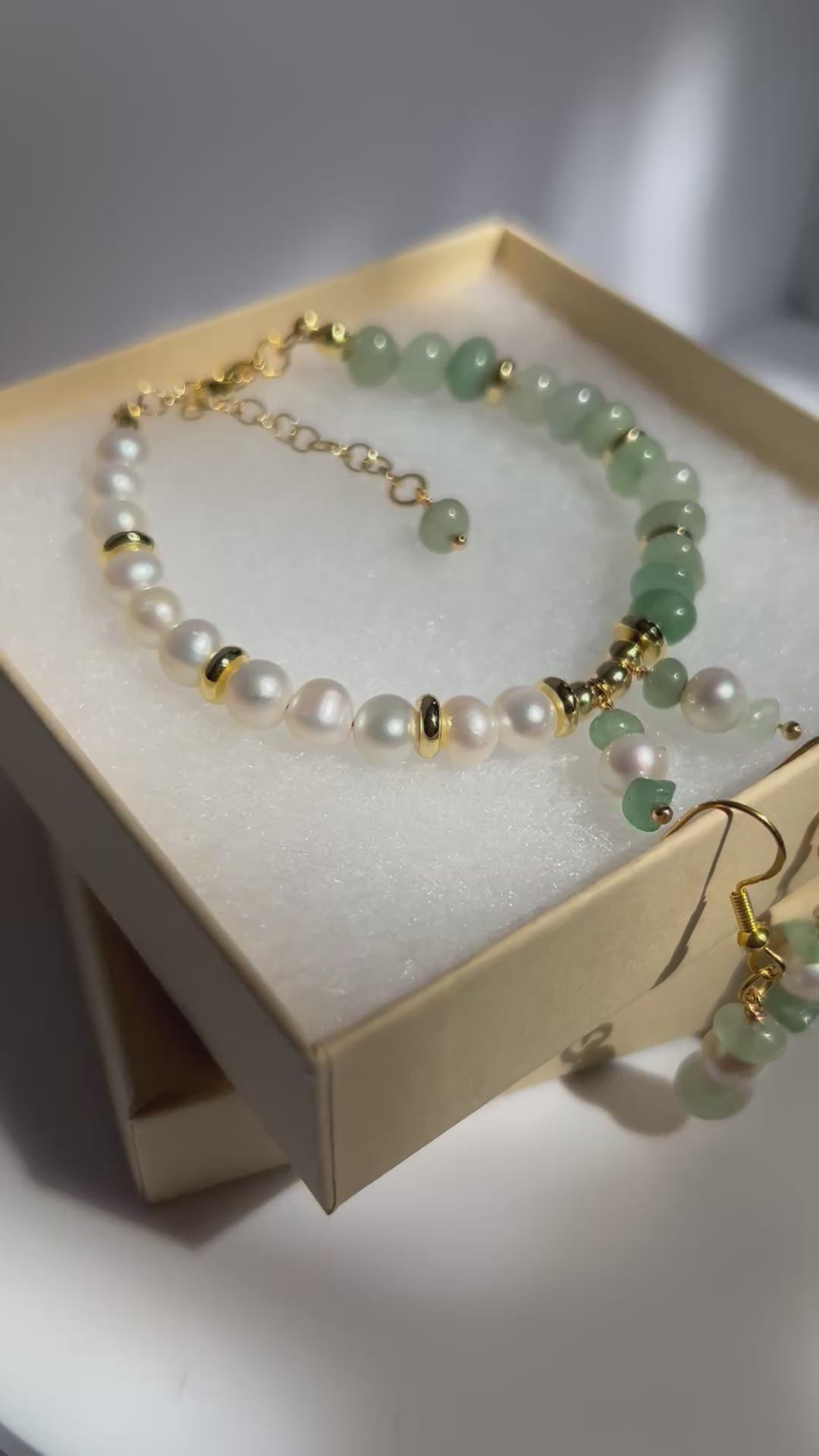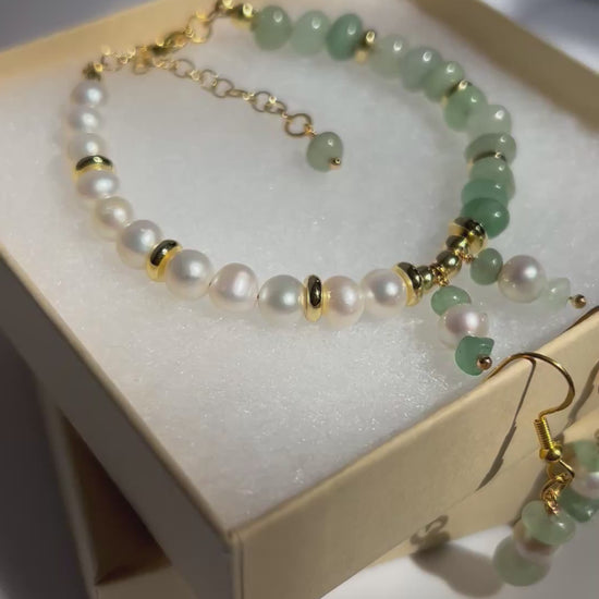White Freshwater Pearls, Green Aventurine Gemstone, 14k Gold Plated Metal Bracelet & Earrings Set